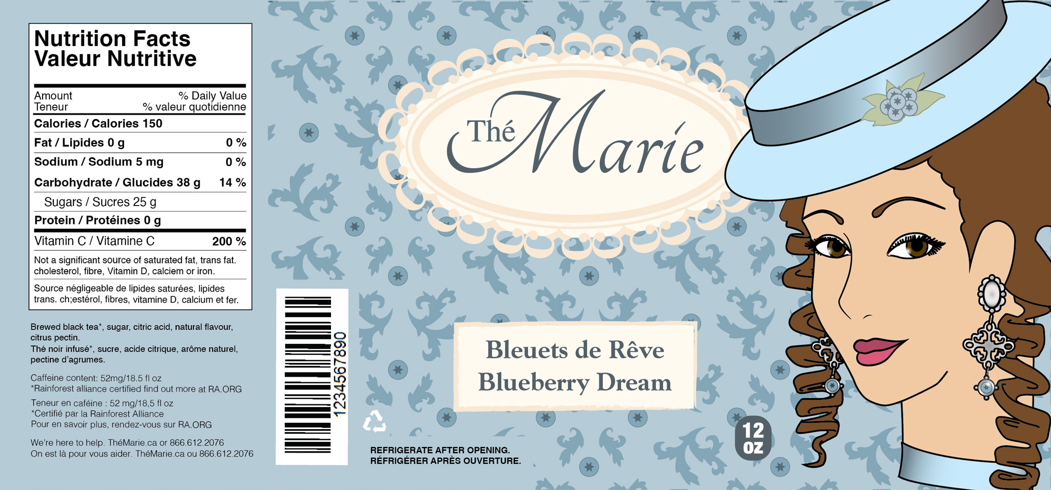 This design was created for my packaging class when I attended John Abbott College. My classmates and I were tasked with creating three drink labels for the same brand. One of the challenges was to include all of the legally required information in both French and English. Additionally, we had to use elements from pop culture. I went with a Rococo theme. To complete this project, I mainly used Illustrator to create each label. As for the drawn head, I first drew her in Procreate before importing her into my Illustrator file.
